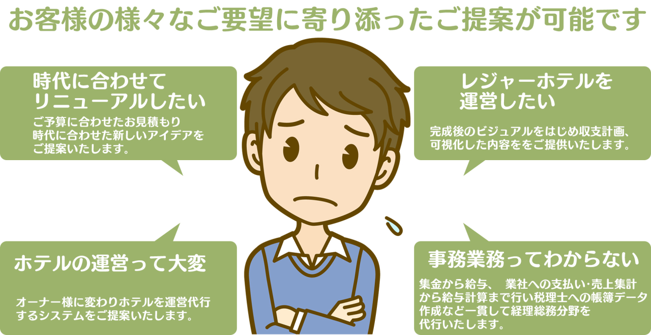 ホテル運営に関わる業務を総括的に代行させていただき、多忙なオーナー様に役立つ契約となっております。